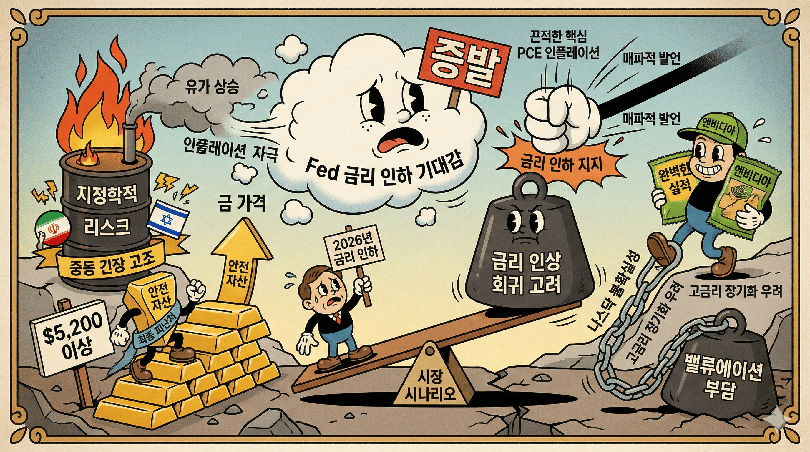금(Gold)은 최근 지정학적 리스크(이란-이스라엘 긴장)가 고조되고 연준의 금리 인하 기대감이 소멸하며 안전 자산으로서의 가치가 극대화되고 있습니다. 금은 $5,200를 돌파하며 강력한 매수세를 보이고 있습니다.