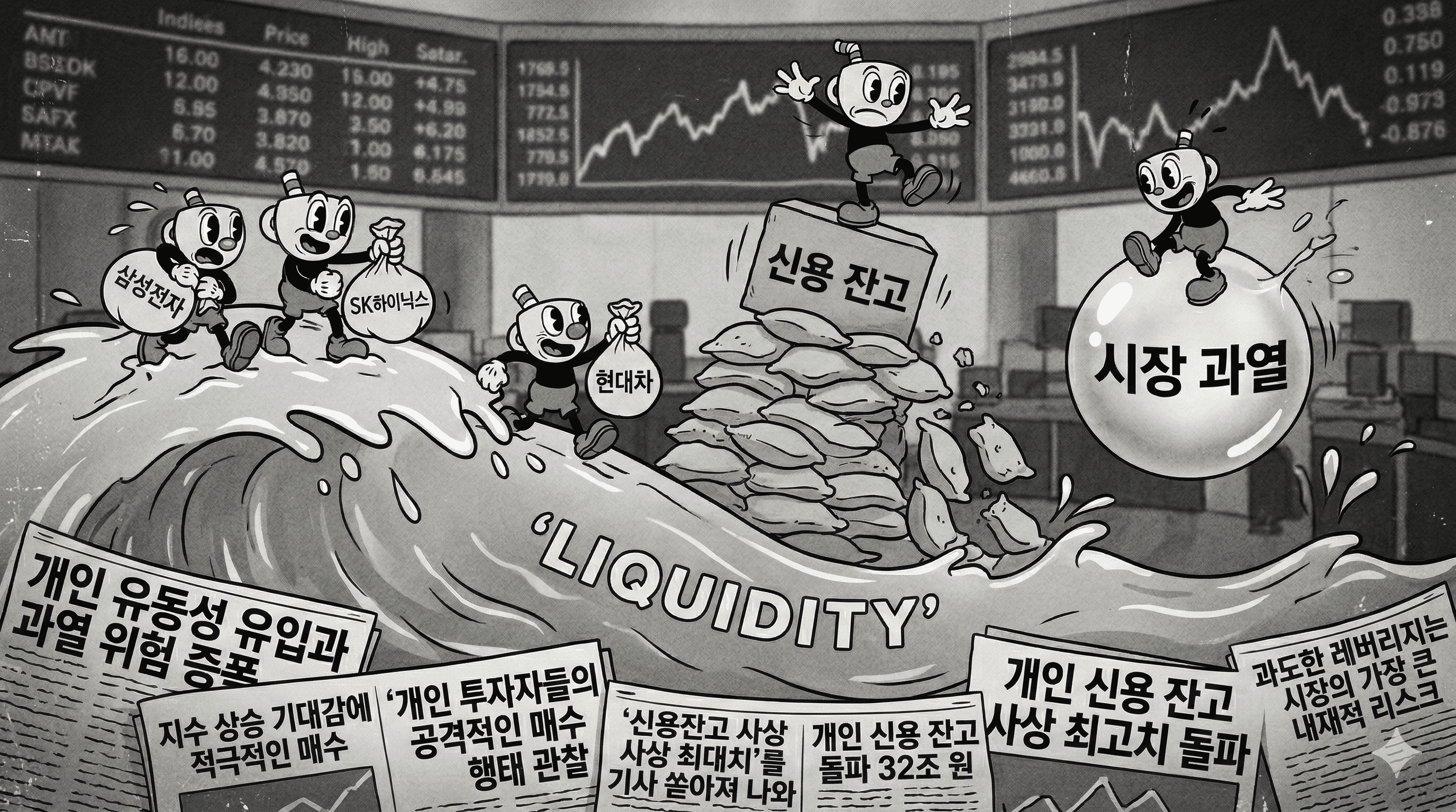 최근 개인 투자자들의 공격적인 매수 행태가 두드러지게 관찰됩니다. 특히, 지수 상승에 대한 기대감이 극에 달하며 적극적인 매수에 나서고 있습니다. 이러한 매수세는 '아파트 대신 주식! 20만 전자, 100만 닉스에 전재산 몰빵'한 사례에서 볼 수 있듯, 특정 대형주(삼성전자, SK하이닉스, 현대차)에 대한 극도의 쏠림 현상을 유발하고 있습니다. 더욱 심각한 것은 이러훈 매수세가 상당 부분 레버리지를 통해 발생하고 있다는 점입니다. '신용잔고 사상 최대치'를 알리는 기사가 쏟아져 나오는 현재, 개인 투자자의 신용 잔고가 사상 최고치인 32조 원을 돌파했습니다. 신용 잔고의 증가는 시장에 유동성을 공급하여 단기적인 상승 탄력을 높이는 효과를 주지만, 작은 조정에도 담보 부족으로 인한 반대 매매가 촉발되어 하락 폭을 증폭시키는 '불안정한 모래성'과 같습니다. 이 과도한 레버리지는 현재 시장의 가장 큰 내재적 리스크로 작용합니다.